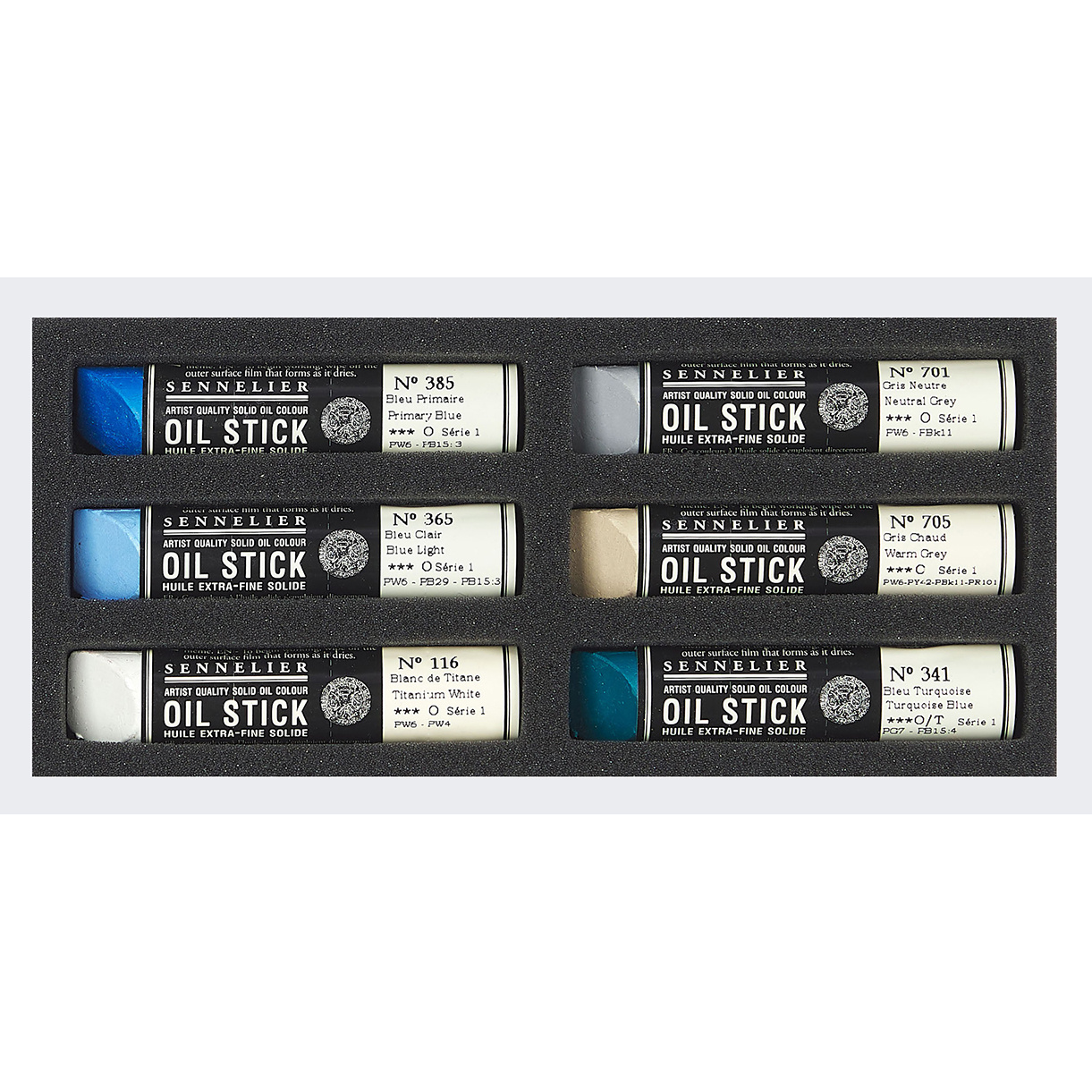 - set met 6 oil sticks in grijs en blauwtinten