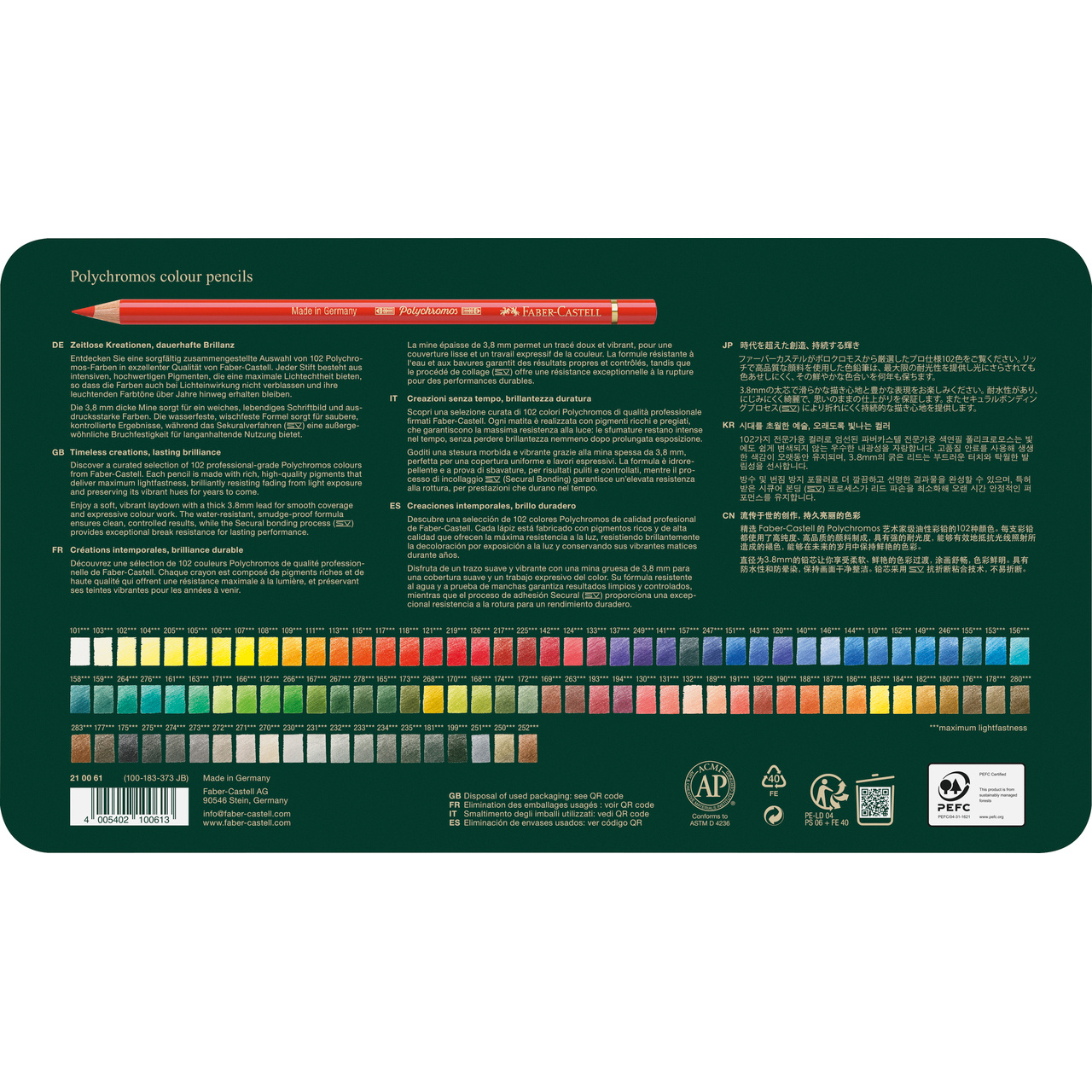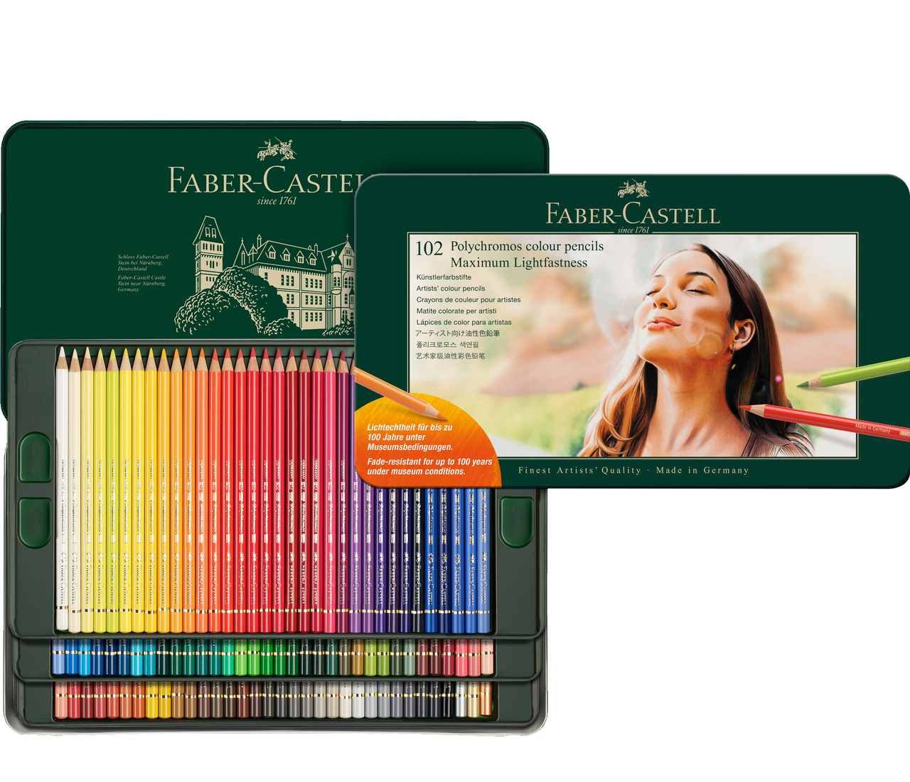Dit blik bevat een selectie van 102 kleuren uit de Polychromos kleurpotloden reeks die de beste graad van lichtechtheid hebben.